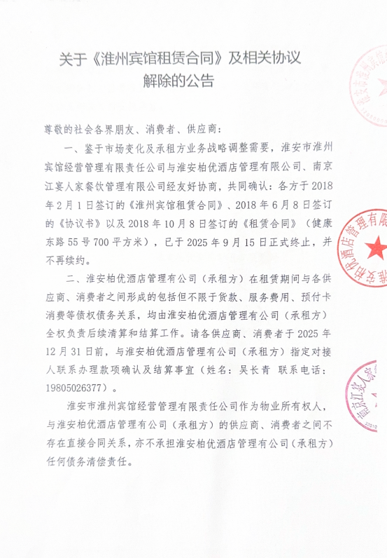 关于《淮州宾馆租赁合同》及相关协议解除的公告